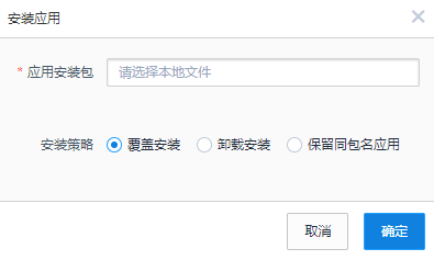 安装应用:从本地选择一个安装包,并可配置是否覆盖安装策略