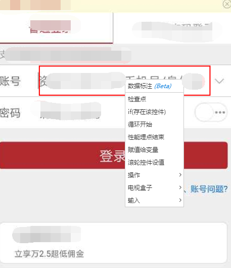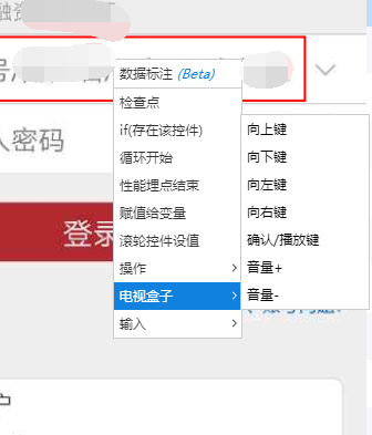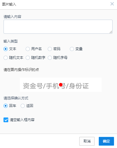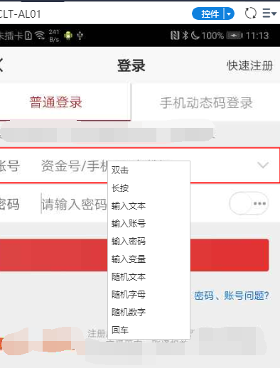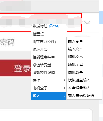 输入:右键输入框可以输入文本、变量、随机文本、随机字母、随机数字、短信验证码、模拟键盘输入、.安全键盘输入。