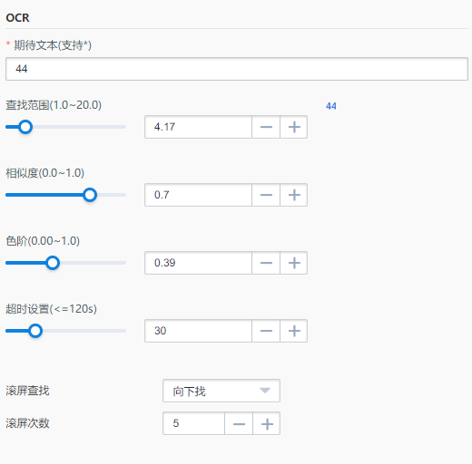 对于OCR操作,属性栏可以更改期待文本、查找范围、相似度、色阶、以及超时设置和滚屏查找设置。