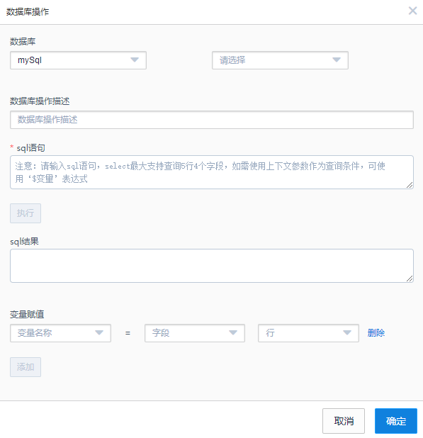 - Sql语句:您需要自己输入要操作的数据库语句。目前只支持4个字段的查询(select与from只能有3个逗号)。您可通过’$变量‘使用变量的值。