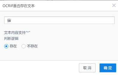 OCRIF是否存在文本:通过OCR识别的方式获取页面控件中的文本与期望文本进行比对,如果存在则执行IF体,如果不存在则跳过IF体执行后续步骤。