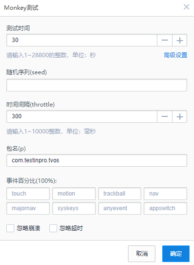 Monkey测试:提供在当前应用下的Monkey测试,可自定义测试时间,最长测试时间为8小时,高级设置中还提供了随机序列和事件间隔等设置,您可以根据需要填写。