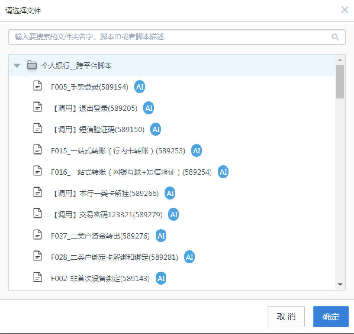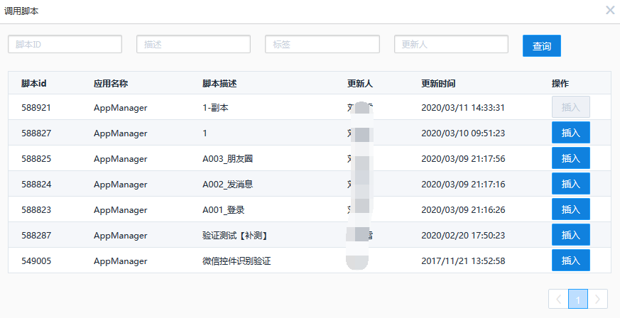 调用脚本:可以在本脚本调用其他脚本进行插入操作,可以通过搜索脚本id、描述、标签和更新人进行查询。