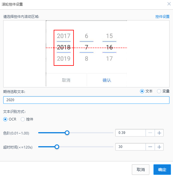 滚轮控件设值:右键某一控件,在控件内选择一滚动区域进行滚动操作,可以设置期待文本作为终点。