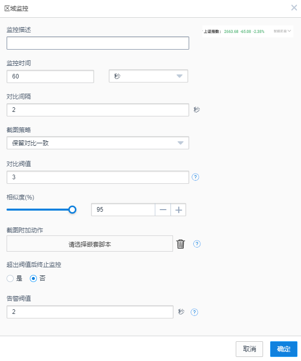 区域监控: 对比x秒前后页面的变化,多用于股票场景点击映射屏右上方的“取图”,用鼠标框中需要对比的区域,然后右键选择“区域监控”配置监控时间、对比间隔等信息后开始监控,其中对比策略=保留对比不一致时,报告中只会出现对比不一致的截图。