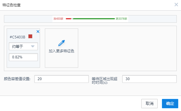 特征色识别: 包括特征色检查和特征色点击两个功能,主要针对一些具有滚动banner的程序,在其滚动过程中可以通过特征色识别来获取特定控件进行检查/点击操作。