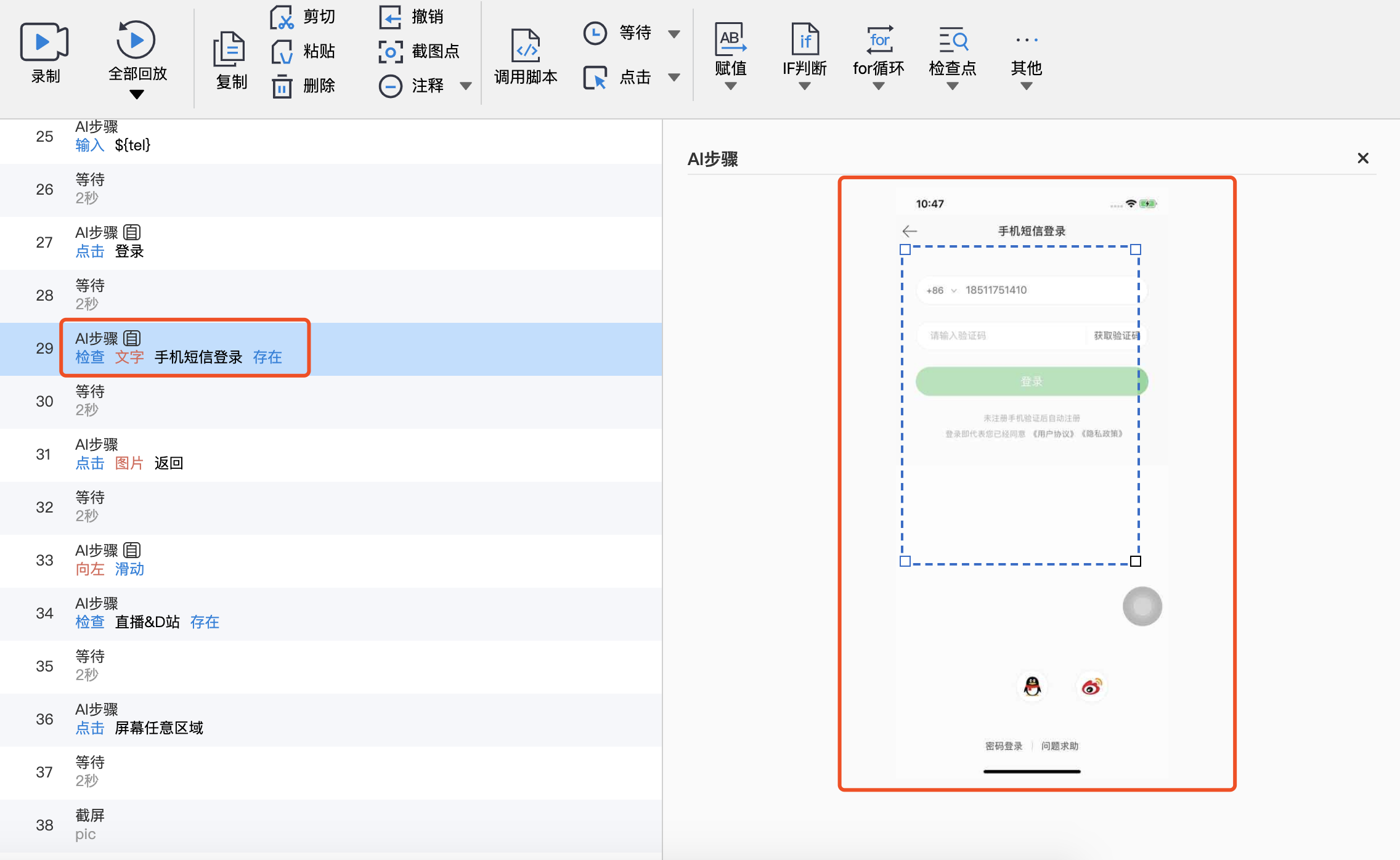 - 从当前回放: 选中一个步骤点击从当前步骤回放后,系统将从当前步骤开始回放,以验证接下来的步骤能否成功执行。