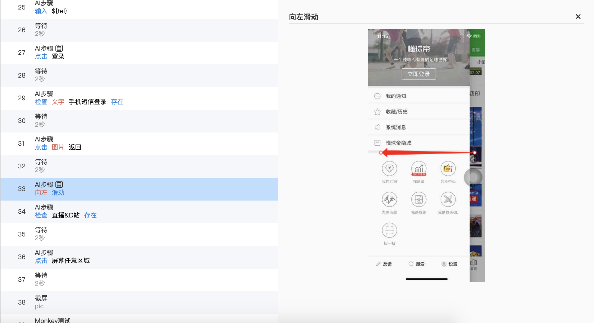 开通AI功能的客户,在新建脚本后,可以看到AI录制模式。在这个模式下,用户可以直接点击屏幕识别的文本,会在右侧生成对应自然语言的语法步骤。