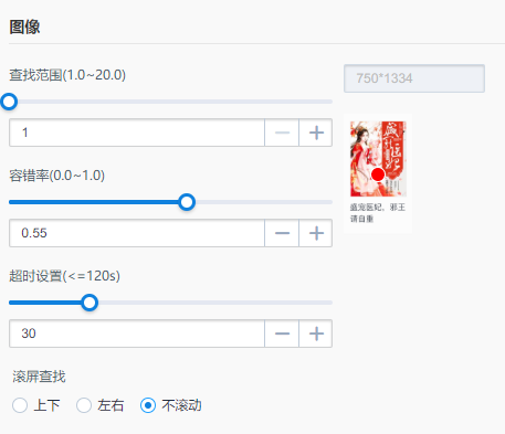 对于图像操作,属性栏可以设置一定分辩率内的查找范围、容错率、超时设置和滚屏查找。