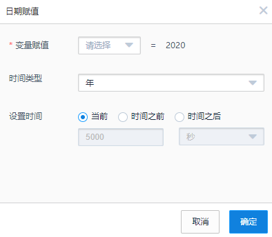 日期赋值:可将当前的年、月、日等时间或当前时间之前/后的一段时间赋值给一个变量,在一些需要输入日期或者时间计算的情况下,都可以使用日期变量赋值。