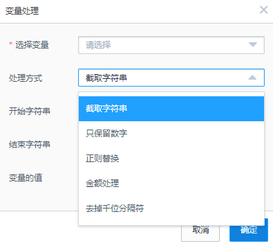变量处理:可以对指定变量进行截取字符串、只保留数字、正则替换、金额处理、去掉千位分隔符处理。