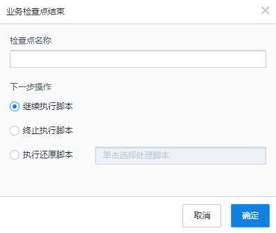 业务检查点:业务检查点步骤为异常处理步骤,如果监控范围内的步骤发生异常,可以选择忽略异常继续执行、结束当前脚本和执行某一条特定的脚本; 选择”忽略异常,继续执行”时,会继续执行对应的“业务检查点结束”后面的步骤,但是脚本结果显示执行未通过,会计入任务未通过结果中进行统计。 如果选择“结束当前脚本”则会立即结束脚本执行,不再执行后续步骤;如果选择“处理脚本”,会在发生异常后执行所选择的脚本。另外,业务检查点步骤在报告中可以通过List查看当条脚本下各个检查点的执行结果和错误信息。